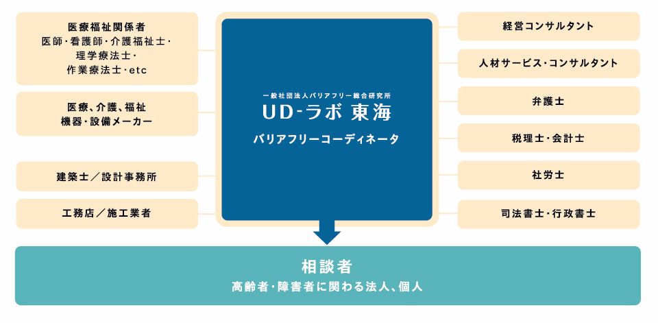 超高齢化社会の今、高齢者が安全で快適に過ごせる環境整備がますます求められています。公共施設の一部ではバリアフリー化が進んでいるものの、まだ十分とはいえません。障がいを持つ人にとっても、社会の受け入れ体制が整っていないのが現状です。一般社団法人バリアフリー総合研究所では、疑問や相談に応えられる窓口が必要と考え、バリアフリーに詳しい専門家のネットワークをつくりました。バリアフリーコーディネーターが、建築士、経営コンサルタント、税理士、ケアマネージャー、看護師、理学療法士、作業療法士などをそれぞれのケースに応じて編成し、解決案を導きだします。バリアフリー建築物や介護についてのご相談から、希望に合わせた、調査、図面作成、施工などを行います。年齢や障がいの有無に関わらず、あらゆる人が安心して利用でき、可能な限り自立して暮らせることが、私たちの思いです。だれにとっても利用しやすいユニバーサルデザインを採り入れ、ノーマライゼーションへの貢献に努めます